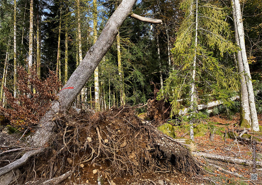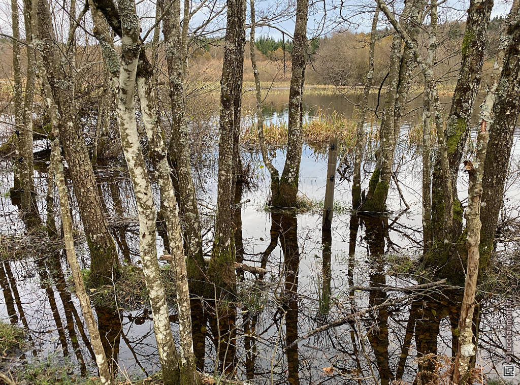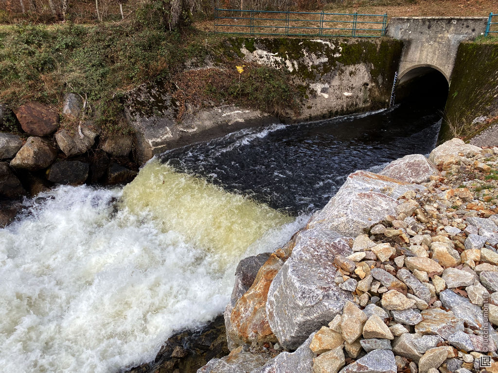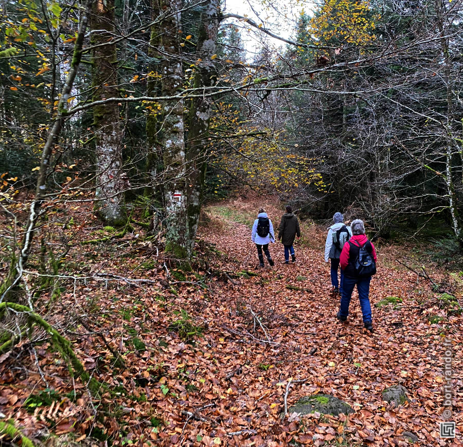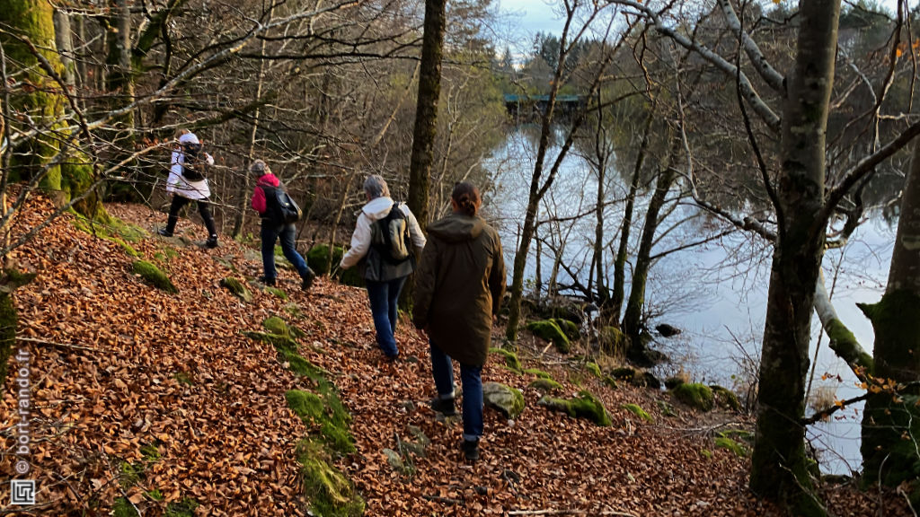 Ensuite, beaucoup d’arbres étant tombés en travers du chemin nous le rendent invisible et donc impraticable… On devra errer un petit moment en cherchant le passage le moins compliqué dans la végétation du sous-bois. Merci au GPS qui nous permit à tout moment de savoir où nous étions et donc comment regagner le moins lentement possible le chemin là où il redevenait praticable, en fait fait le long de la rive (du Lac de la Crégut, cette fois).