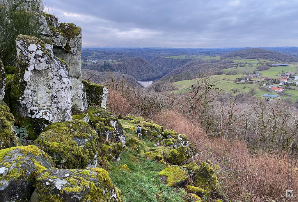 Côté Nord, on a vue sur le village de Gioux (ici à droite) et sur le barrage de Marèges (dont la voute est visible au centre).