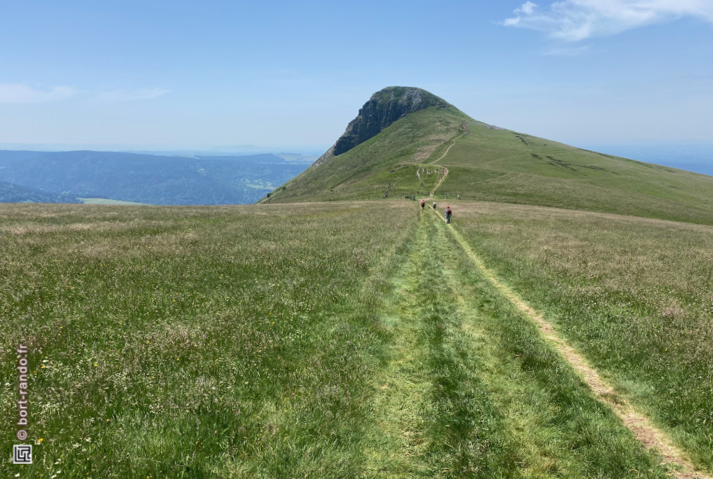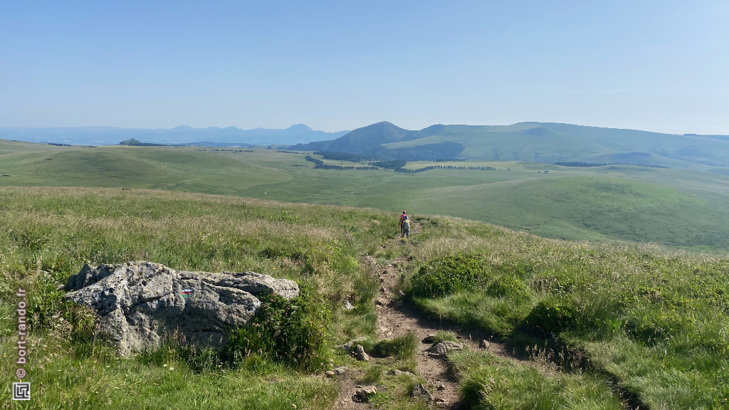 Ensuite, on redescend pour être sur le plateau. Là-bas, à l’horizon, côté Nord-Est, on voit le Puy de Dôme, entouré des autres volcans.