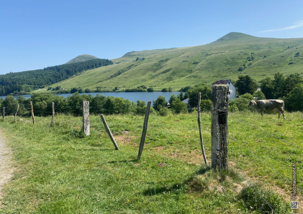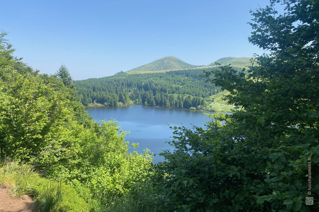 Le chemin qui longe le lac côté Ouest remonte sérieusement et, par cela, offre un beau point de vue sur le la. En arrière-plan, le Puy de l’Ouïre.