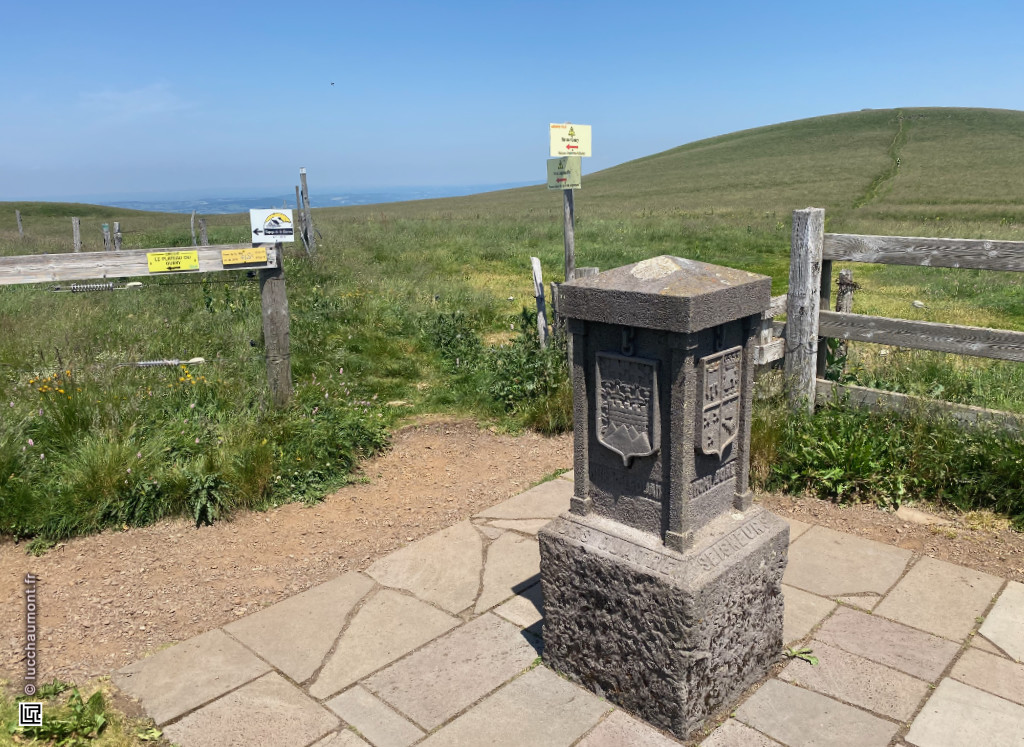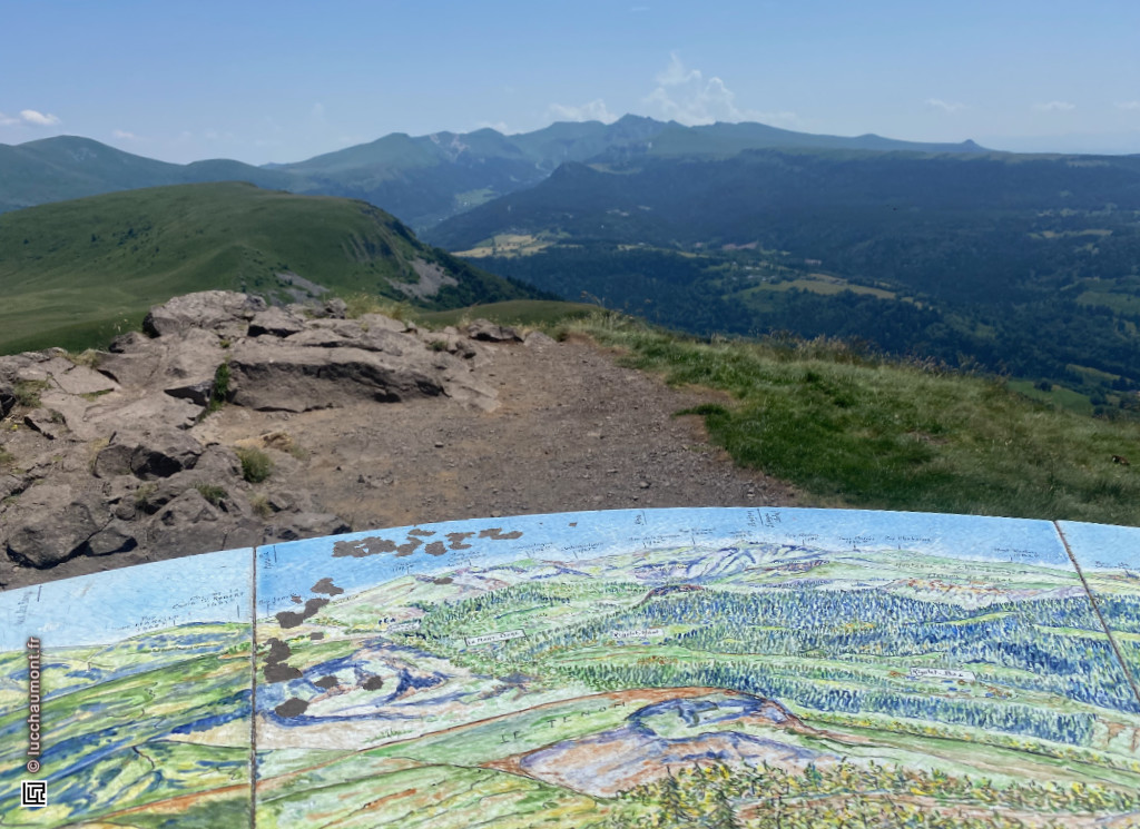 Au sommet de la Banne d’Ordanche, une vue magnifique à 360°, dont ici vers le Sud sur le Massif du Sancy. Avec table d’orientation.