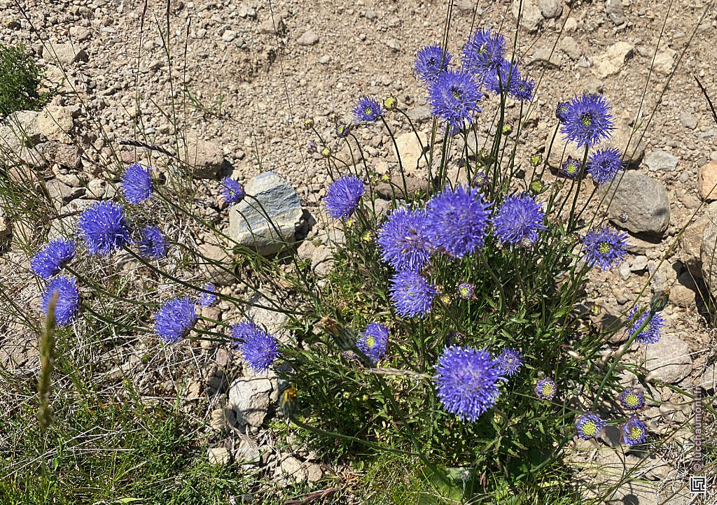 En fin de parcours, dans la pierraille du bord de la route nous voyons de la jasione, plante qui semble aimer les climats rudes et l’altitude.