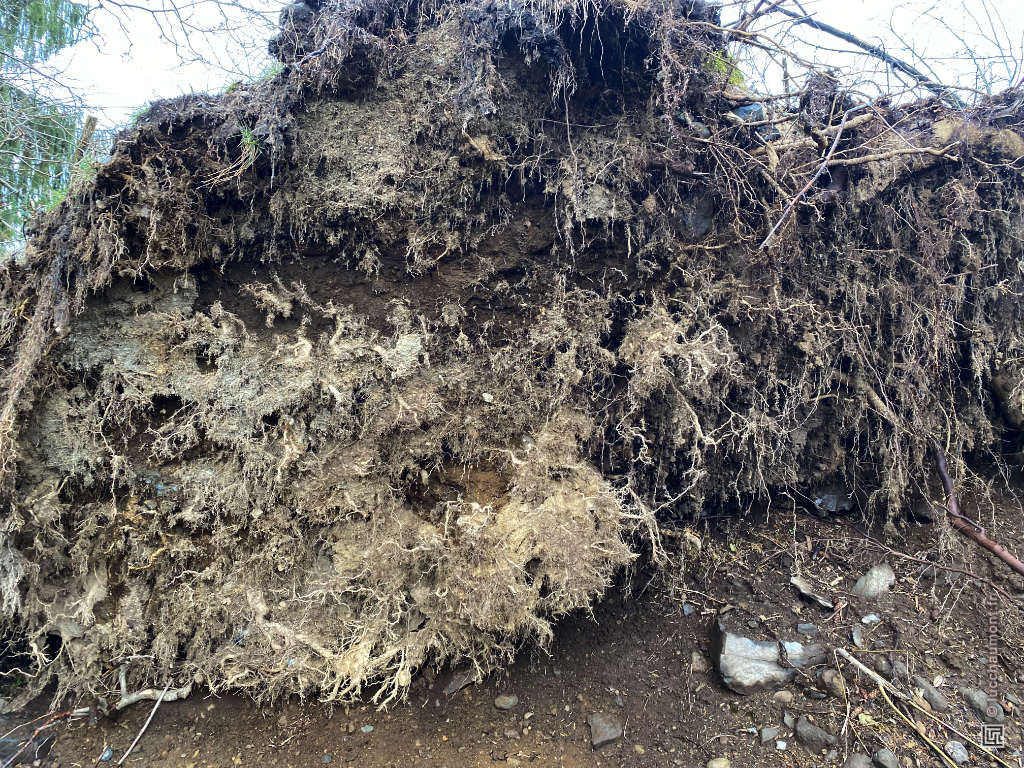 Voilà, au bord du chemin, encore un arbre qui n’avait pas dans son programme de croissance de développer de fortes racines profondément ancrées et qui aura fini par être abattu par une tempête :